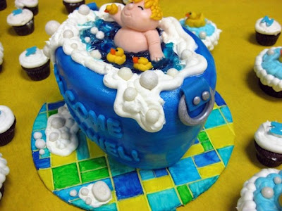 This cake and cupcakes were made for Stefani King, an expectant mom at my school. Jessica Ham was planning the shower with a rubber ducky theme. I really was not sure what to do, so I scoured the internet like I always do, and found a lot of cute ideas. I also used some decorative tubs Jessica was using for centerpieces to help design the cake tub.